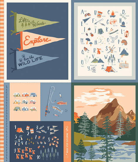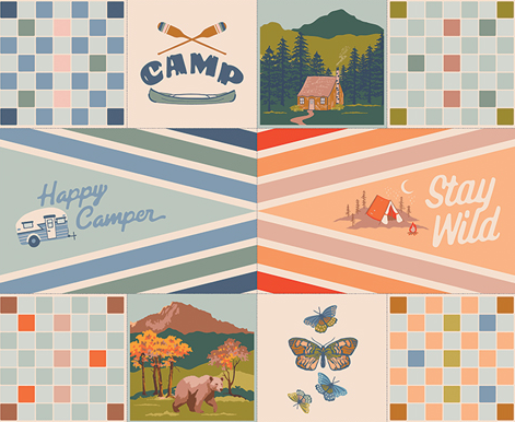 Let's go for a camping trip with this adorable camping and fishing line! With a mix of bright and pale corals, blues, and greens, these would make for the cutest quilt, runners, toppers, or any other fun projects for your camper.