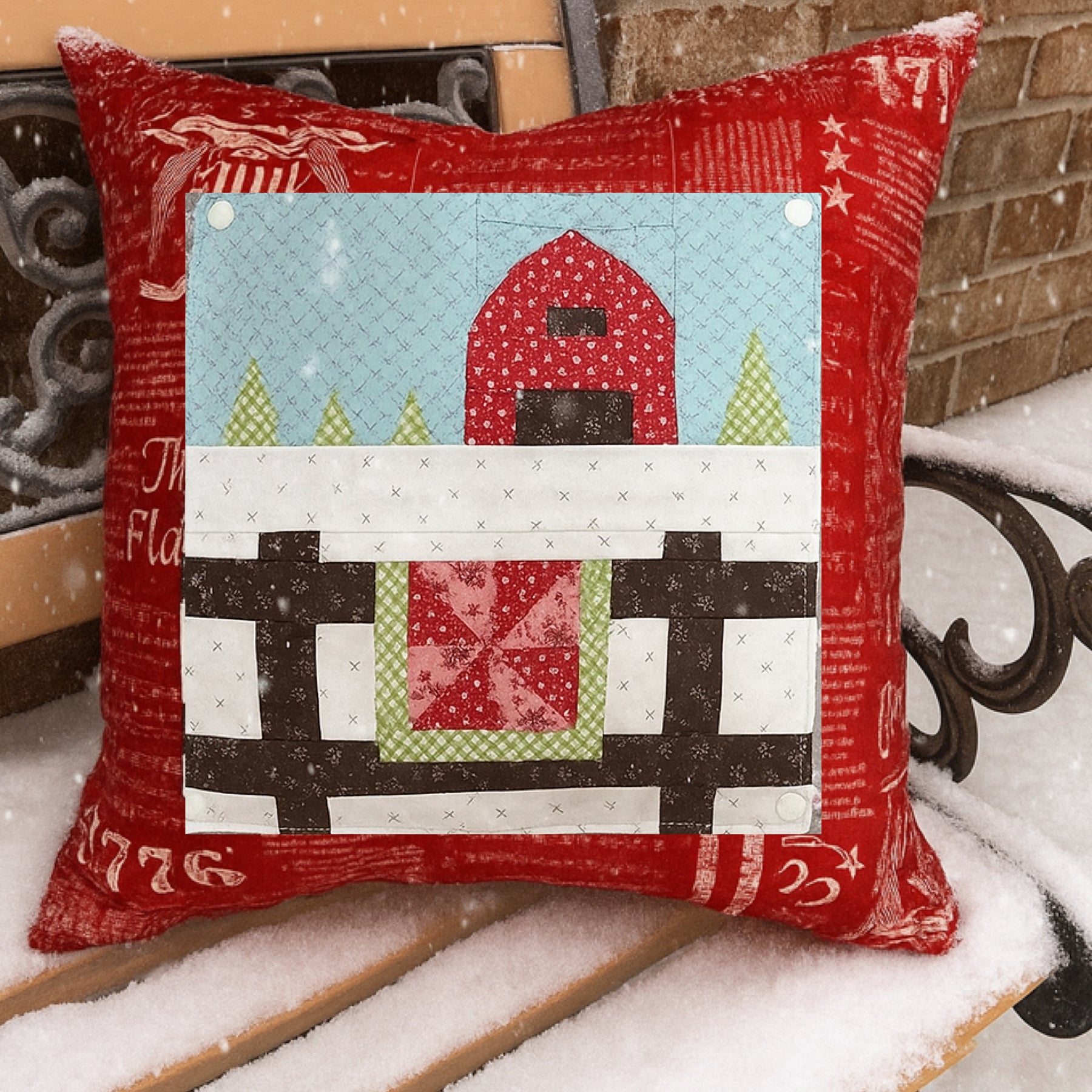 The Helpful Heifer pillow is 20" x 20". The kit includes a paper pattern, fabric and snaps for your quilted pillow.