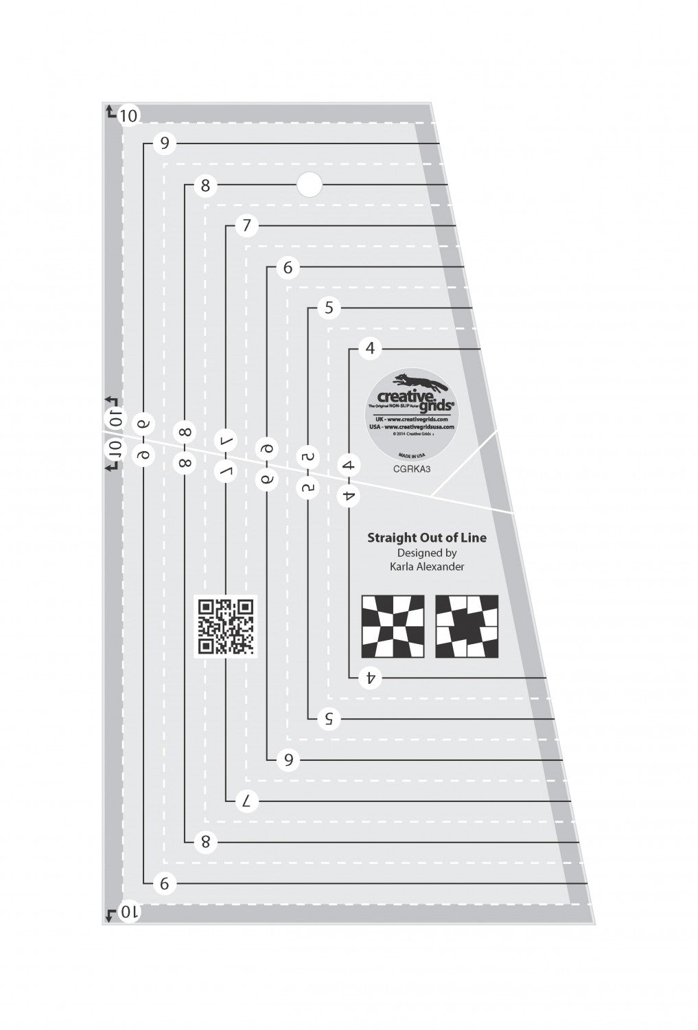 The Straight Out of Line tool creates unique four-patch blocks with the illusion of curves. Use the ruler markings to cut squares from 4 – 10 inches – and every half-inch in between. The finished size of the pieced block is approximately 3/4 inch less than the cut block.