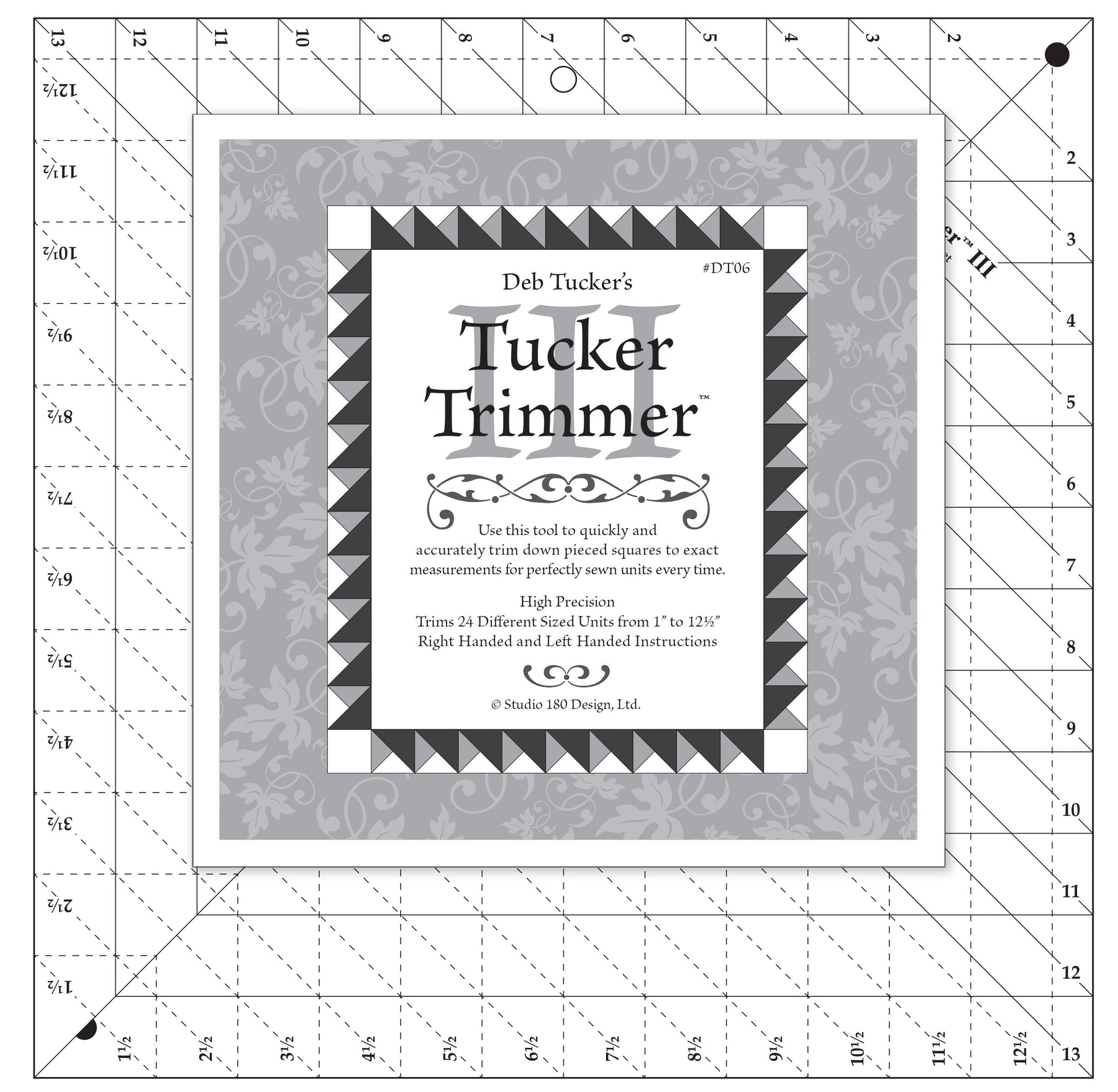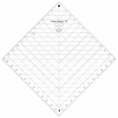 The third in the Tucker Trimmer series of rulers, this version of our Tucker Trimmer is used for any block or unit that is larger than a 6in finished block size. It has all of the sizes of the Tucker Trimmer 1 plus thirteen additional size options up to and including trimming blocks to 13in (that will finish to 12.5in when sewn). I love to use this tool to trim down my Lemoyne Star blocks made with my Rapid Fire Lemoyne Star tool and any type of block that needs to be trimmed and squared to a specific size. A terrific tool with all the same benefits as the original Tucker Trimmer.
