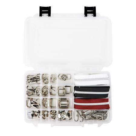 Included in your organized set: - 16 Swivel Hooks: (4) 1/2in, (4) 3/4in, (4) 1in, (4) 1-1/2in - 16 D Rings: (4) 1/2in, (4) 3/4in, (4) 1in, (4) 1-1/2in - 16 Rectangle Rings: (4) 1/2in, (4) 3/4in, (4) 1in, (4) 1-1/2in - 8 Sliders: (2) 1/2in, (2) 3/4in, (2) 1in, (2) 1-1/2in - 4 Magnets: (2) 1/2in, (2) 3/4in - 8 Bucket Feet - 8 Dome Feet - 1 yard of Black Zipper and 3 pulls - 1 yard of White Zipper and 3 pulls - 1 yard of Mystery Zipper and 3 pulls - Plastic Locking Compartment Box