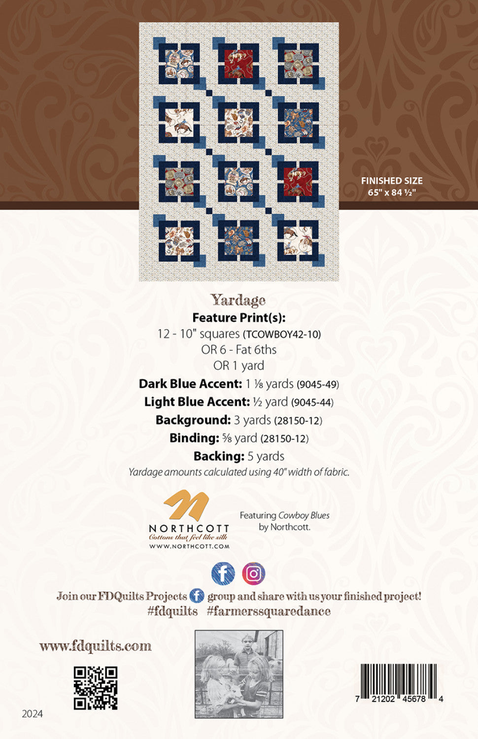 Quilters of all skill levels will enjoy this quick and easy pattern. Farmer’s Square Dance is an easy pattern to kit, using either 12 – 10” squares, 6 Fat Sixths or 1 Yard of a focal print. We love how the quilt showcases focal prints! The pattern is printed in full color with easy-to-follow instructions and graphics. The finished size is 65” x 84.5”.