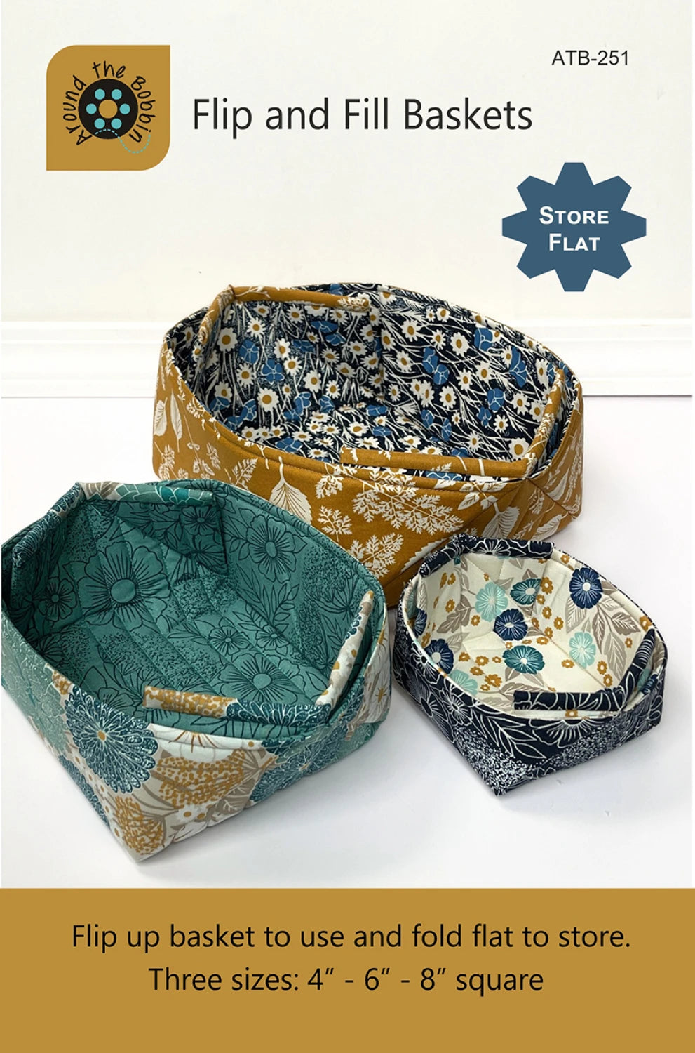 Flip and fill baskets are both pretty and functional. Designed for organizing sewing, craft or household items, these innovative baskets fold flat for convenient storage when not in use. They are simple to sew and make excellent gifts. Fat quarter friendly. Makes 3 sizes – 4 in, 6 in and 8 in baskets.