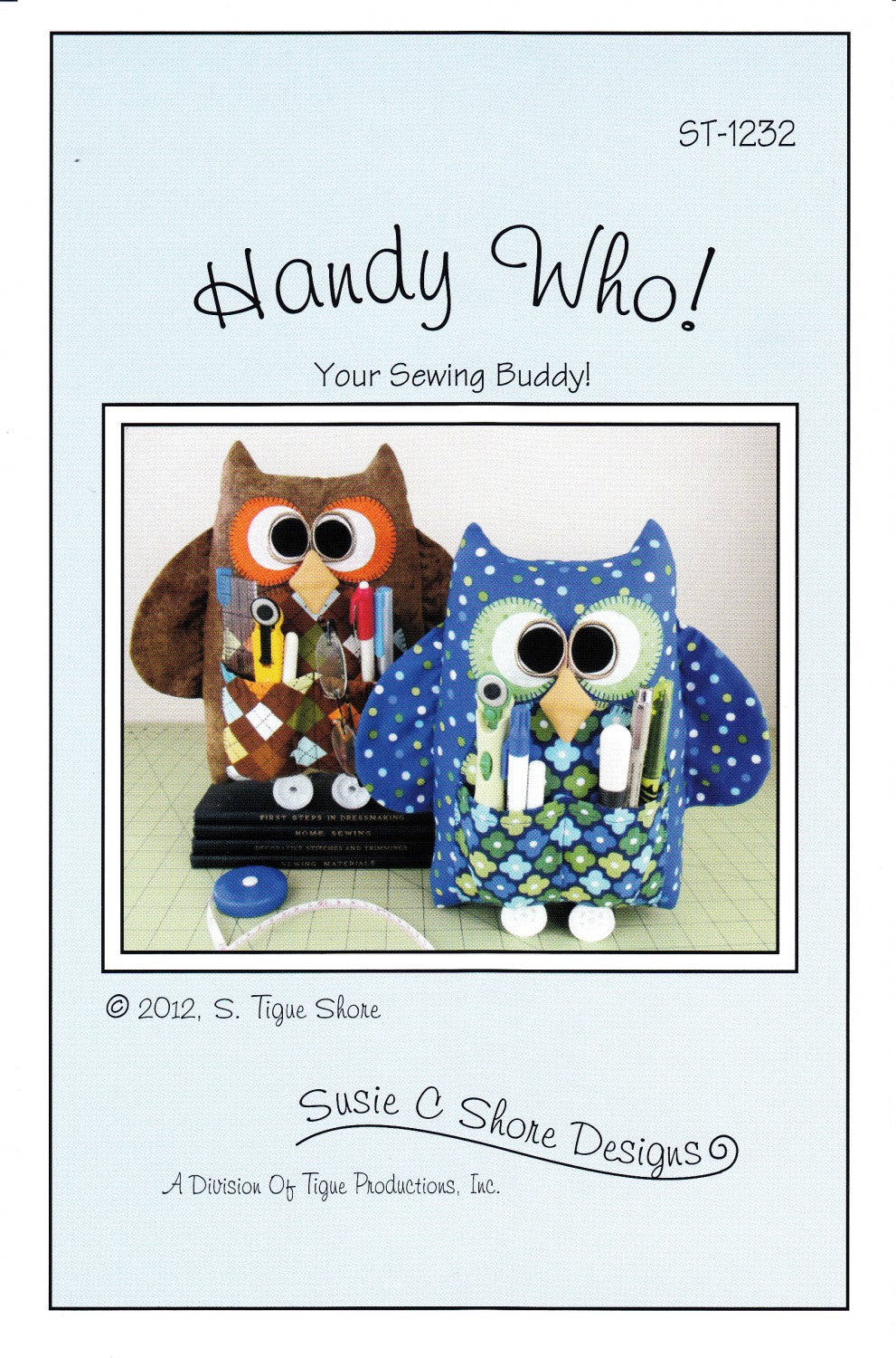 Keep your sewing tools close at hand in your work room with "Handy Who!" His glasses are removable scissors; and with 3 pockets (two in front and one in back), he will hold lots of tools in front while allowing you to stash bobbins, tape measures, needle cases and more. Your new sewing buddy!