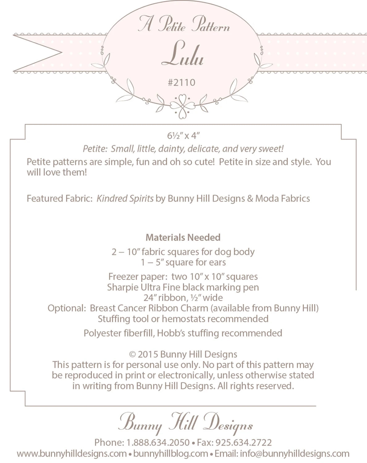 LuLu is a charming petite pattern designed for crafting an adorable 6-1/2in x 4in dog doll. This delightful project features a dog adorned with a pink and white striped bow and a polka dot accent, all set against a soft floral fabric. The pattern is perfect for small, fun, and oh-so-cute projects, making it ideal for both personal enjoyment and as a thoughtful gift. The design includes detailed instructions for sewing and stuffing, ensuring a high-quality finish. The pattern is from Bunny Hill Designs, known for their whimsical and elegant fabric choices, and it supports a good cause with an optional Breast Cancer ribbon charm available.