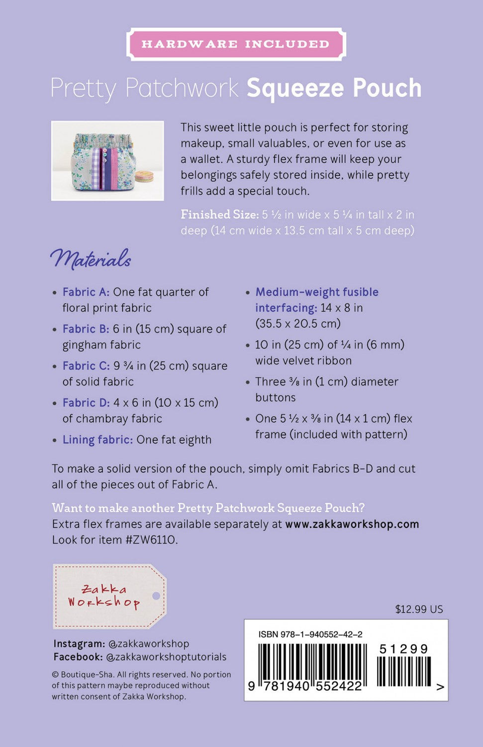 This sweet little pouch is perfect for storing makeup, small valuables, or even for use as a wallet. A sturdy flex frame will keep your belongings safely stored inside, while pretty frills add a special touch. Finished Size: 5.5in wide x 5.25in tall x 2in deep (14 cm wide x 13.5 cm tall x 5 cm deep) Pattern includes one 5-1/2 x 3/8in (14 x 1 cm) flex frame needed to make the pouch. Refill frame available.