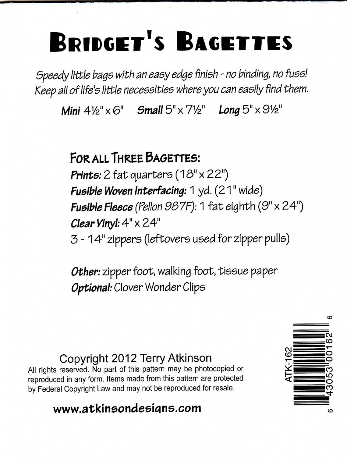 Speedy little bags with an easy edge finish. No binding, no fuss! Keep all of life's little necessities where you can easily find them. Mini 4-1/2in x 6in, Small 5in x 7-1/2in, 5in x 9-1/2in