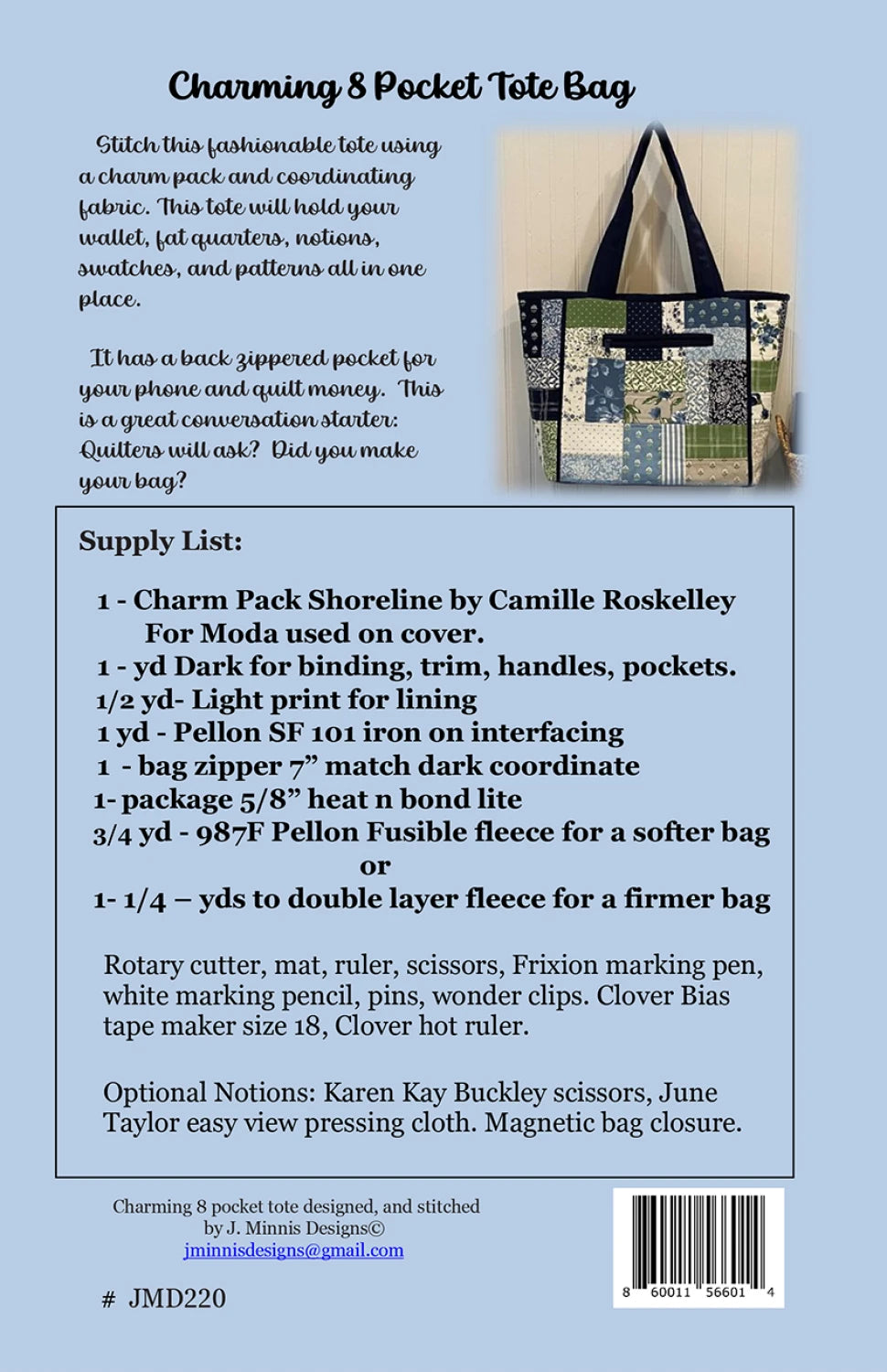Stitch this fashionable tote using a Charm Pack and coordinating fabric. This tote will hold your wallet, fat quarters, patterns and swatches all in one place while visiting quilt shops or on a retreat. It has a back zippered pocket for your phone and quilt money.