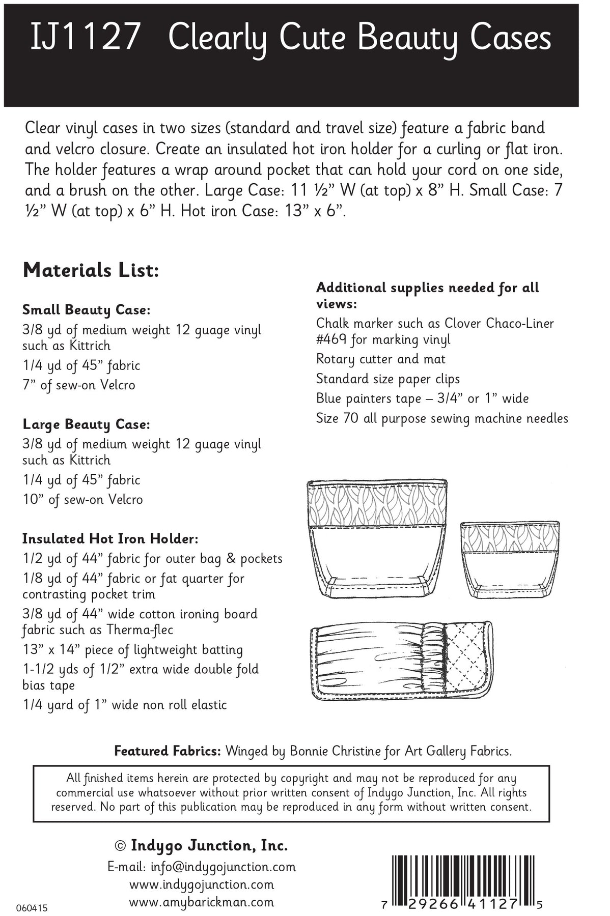 Clear vinyl cases in two sizes (standard and travel size) feature a fabric band and hook and loop closure. Create an insulated hot iron holder for a curling or flat iron. The holder features a wrap around pocket that can hold your cord on one side, and a brush on the other. Large Case: 11 ½” W (at top) tapering to 8-1/2in W (at base) x 8in H. Small Case: 7-1/2in W (at top) tapering to 5-1/2in W (at base) x 6in H. Hot iron Case: 13in H x 6in W.