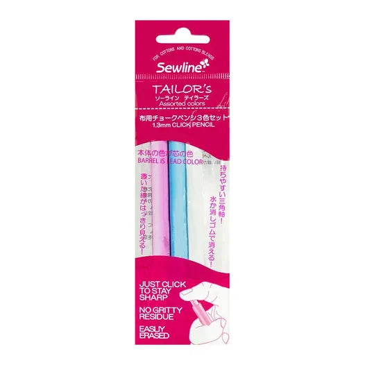 Sewline Tailor's Click Pencils provide clearly seen lines with a 1.3 mm lead. These pencils require no messy sharpening and are erased easily with water or a polymer eraser.