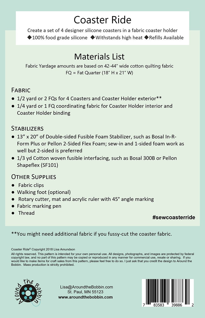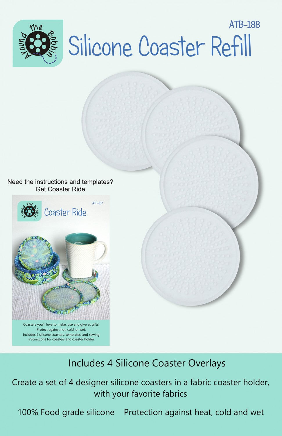 Create a designer silicone coaster set in a fabric holder. The silicone protects surfaces against hot, cold and wet beverages and your customers customize with their favorite fabrics. Four transparent silicone coaster pieces, instructions and template are included to make a set of 4 silicone coasters in a fabric coaster holder. Silicone is 100 percent food grade silicone and heat resistant up to 450 degrees. Refill coasters available.
