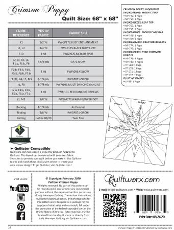 Crimson Poppy is constructed using five distinct sections: G roup J is comprised of 8 center diamonds Groups K, L, and M radiate out from the center star in three additional rounds of 8 star points each; and Group F is a pieced border added to the rounds to result in a 68 square quilt.