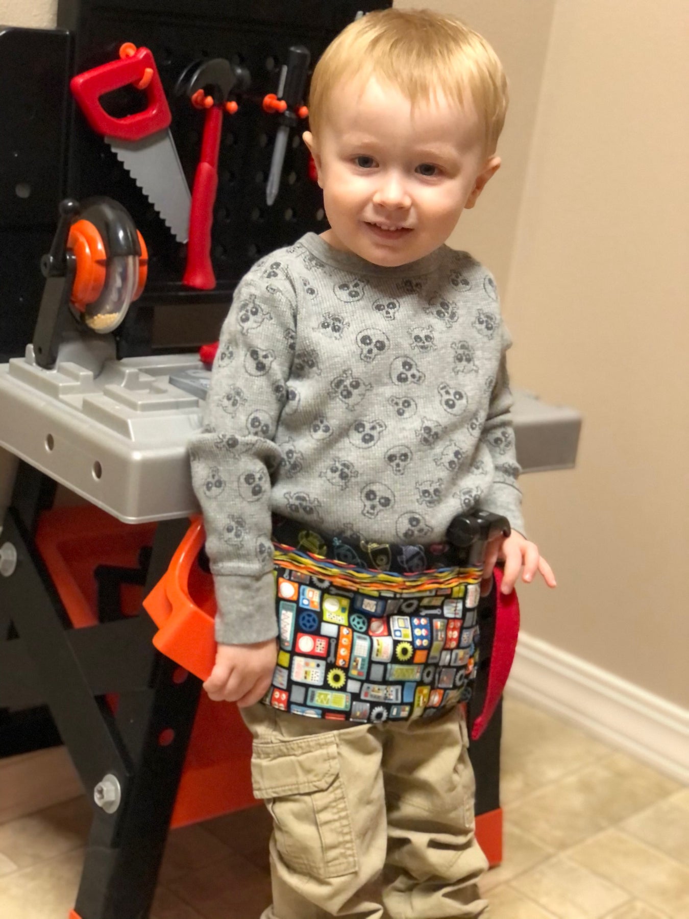 This utilitiy apron is perfect for your favorite kid to carry all their tools in! Sizes 2/3 or 4/6.