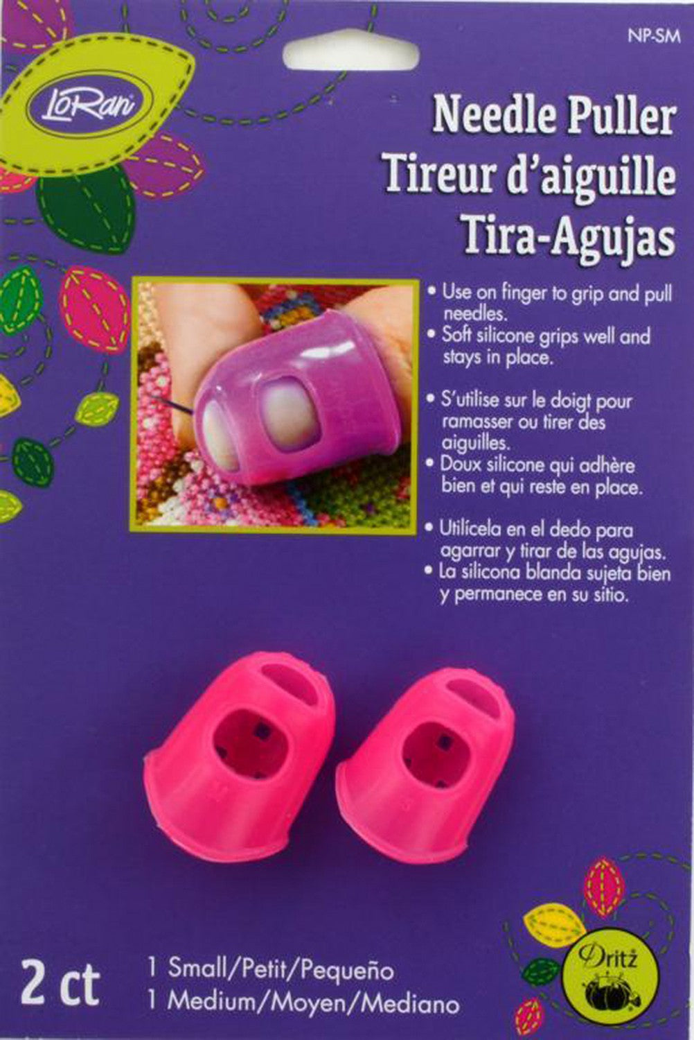 Stay On Needle Puller. Dritz-LoRan Stay On Needle Puller. Use on finger to grip and pull needles. Soft silicone grips well and stays in place. This package contains two needle pullers in two different sizes. Medium and Large.