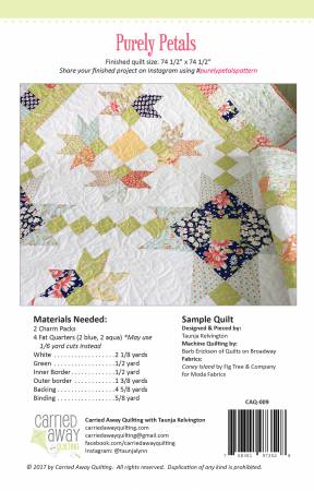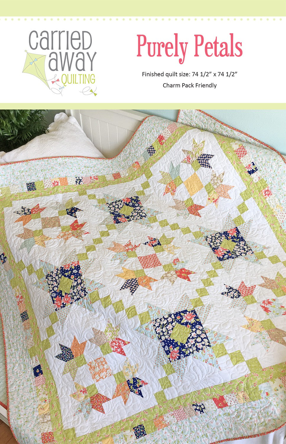 Purely Petals is a charm pack friendly quilt measuring 74 1/2in x 74 1/2in. This scrappy quilt shines with lively flower petals and pretty star blocks, all framed nicely by a pieced border.