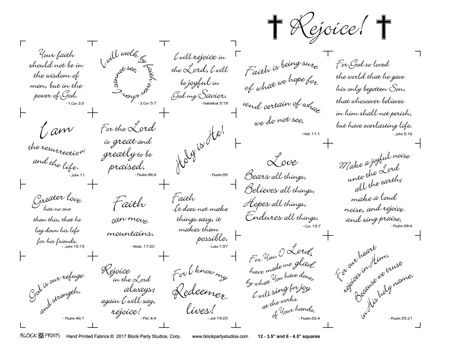 Rejoice with faith and love! Celebrate your faith with this pattern panel of 12 - 3.5" and 6 - 4.5" squares on white or natural 100% Kona Cotton fabric. Quilt from pattern measures 48" x 57".